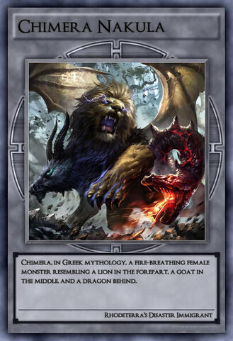 Vorst Nakula is a monster in the body form of a lion, the protruding head of a goat, and a tail that might end with a snake's head. He might burn you out and bring you a great disaster. He was teaming up with Vorst Rigel, another monster who created a disaster, a Charybdis.